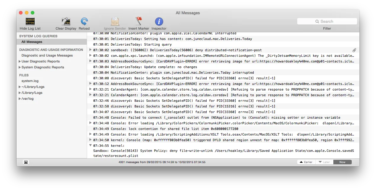 “Having excised most of the old dross and accumulated extensions, and running a fairly clean El Capitan system, my All Messages [in Console] clocks up around 4000 messages every 8 or 9 hours. At its worst – straight after the OS X 10.11.5 update, for example – it can fill those 4000 message slots in a minute or two, but even overnight when the system is not asleep it will seldom stretch to much longer than 12 hours. A traditional Unix wizard would have the screaming ab-dabs at this. We used to tweak, tune, and pare down systems until they barely coughed into their logs. It used to be the mark of a well-loved system.”