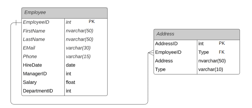 The Employee and Address tables are linked by the key column EmployeeID. It is a foreign key in the Address table linking to the primary key EmployeeID in the Employee table. Thus, one record of the Employee table can point to multiple records in the Address table. This is a One-to-Many relationship.