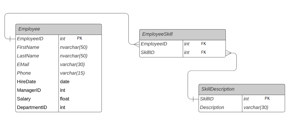 Every employee in the Employee table can have one or many skills. Similarly, a skill in the SkillDescription table can be linked to many employees. This makes a many-to-many relationship.