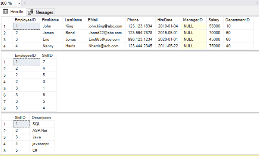 In the example above, the EmployeeSkill is the junction table that contains EmployeeID and SkillID foreign key columns to form many-to-many relation between the Employee and SkillDescription table. Individually, the Employee and EmployeeSkill have a one-to-many relation and the SkillDescription and EmployeeSkill tables have one-to-many relation. But, they form many-to-many relation by using a junction table EmployeeSkill.