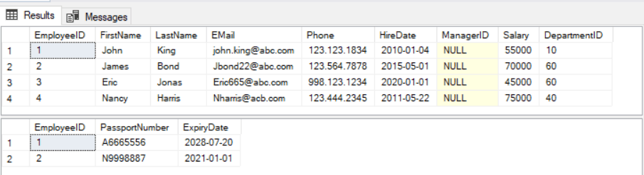 The following is the result of the above queries that demonstrate how each employee has none or just one corresponding record in EmployeeDetails table.