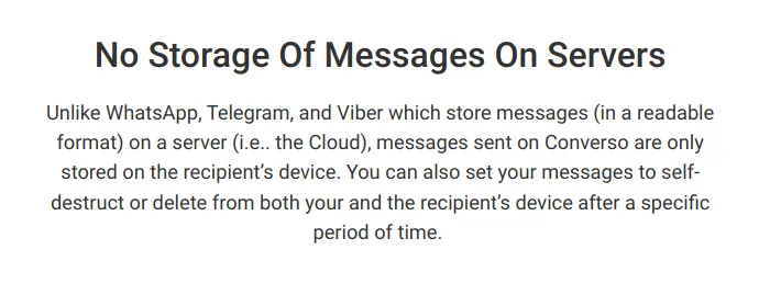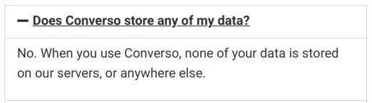 Claim: ‘Absolutely no use of user data’, ‘No tracking’, ‘When you use Converso, none of your data is stored on our servers, or anywhere else’