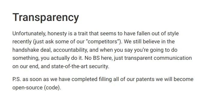 Unfortunately, Converso is not open source and their website is totally silent on cryptographic primitives and protocols, which is highly unusual for a self-proclaimed ‘state-of-the-art’ privacy application. By comparison, Signal, WhatsApp, and Telegram, each [1, 2, 3] make public in-depth technical explanations of their end-to-end encryption systems, which are formally tested and reviewed by external experts. Converso on the other hand claims that they’re waiting for patents before they open source their code.