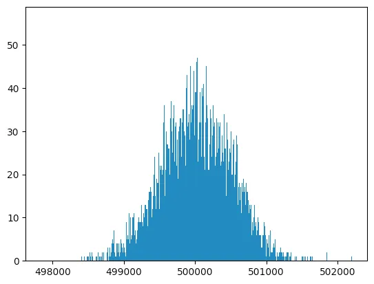 Looks pretty reasonable. Doing another 10000 trials, we get a mean of 499865.8, which seems like we’re getting the same behaviour as DuckDB. Now let’s plot those 10000 trials in a histogram: