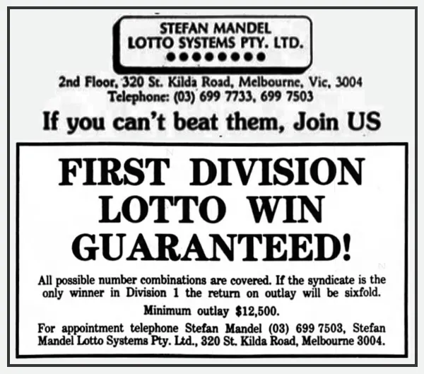 An advertisement Stefan Mandel ran in Australian newspapers to find investors for his lottery schemes (The Age, 1986-7)